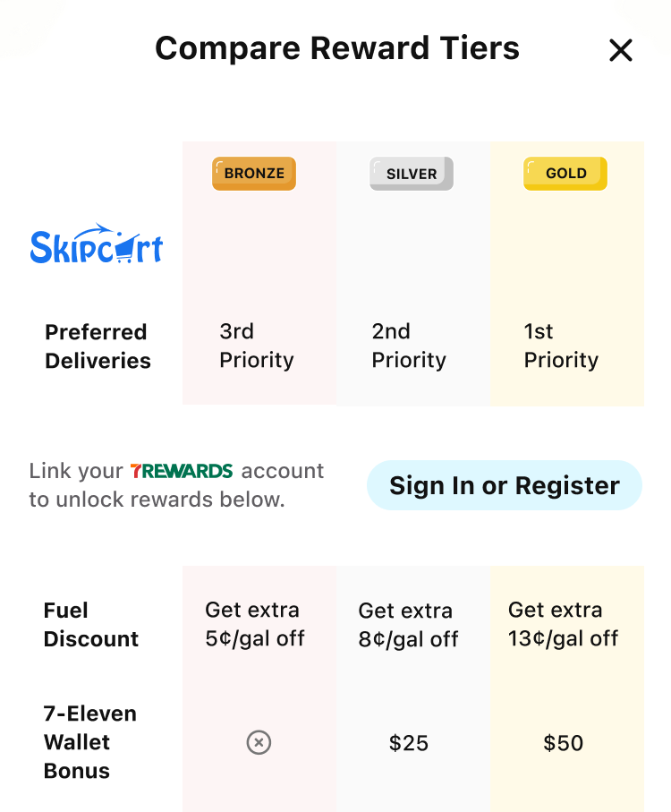 We’ve partnered with 7-Eleven to give you access to exclusive rewards like Fuel Discounts and 7-Eleven Wallet bonuses. Link your 7REWARDS account to your Skipcart account and start earning rewards!